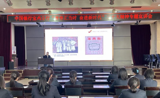 为强化思想教育,深入贯彻党的二十大精神,以党建带动团建,激励广大青年提高政治站位,强化战略执行,奋勇建功立业,4月26日下午,我院学生党支部书记席银联受邀中国银行宝鸡分行作党的二十大会议精神专题宣讲。中国银行宝鸡分行办公室、团委负责人,各部室青年员工代表共同聆听了此次宣讲会。