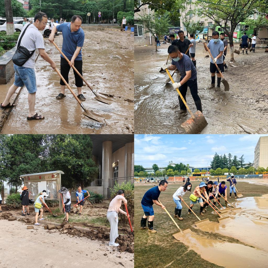 暴雨无情人有情,危难时刻勇担当。汛情发生后,学院党政领导班子成员和教职工第一时间到岗,学院党委书记韩星明、院长张光南带领学院教职工投入排水清扫、淤泥清理攻坚战,全体教职工以高度的责任感投入到防汛清淤工作中,广泛开展安全排查、物资搬运、灾后重建等应急工作,用实际行动践行责任与担当。