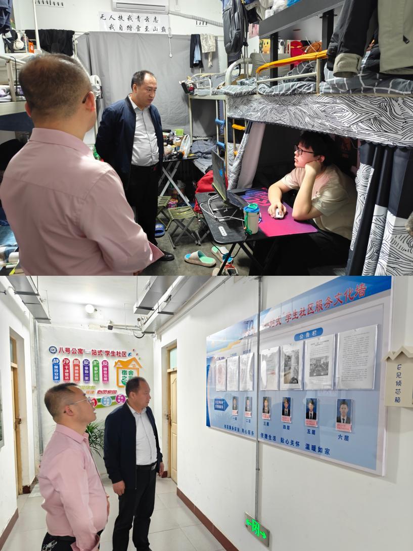 随后,韩星明来到“一站式”学生社区工作室及党团活动室检查工作。学生社区整洁干净,布局合理,文化墙上张贴着学生活动照片及学生组织工作安排。韩星明表示“一站式”学生社区是拉近师生距离的育人新阵地,可以面对面对同学们进行思想引导、学业辅导、心理疏导、就业指导等,实时解决同学们的现实问题和困惑,更好地陪伴学生健康成长,促进学生全面发展。