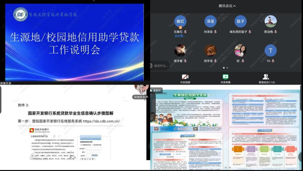 612日晚,学院通过腾讯会议举办生源地及校园地信用助学贷款政策宣讲会,学院资助辅导员与300余名受助学生参会,为学子点亮求学明灯。