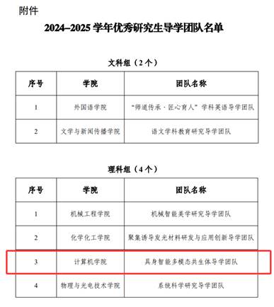 2025年,我院科研工作深入学习贯彻党的二十大、二十届三中全会精神,全面落实立德树人根本任务,以“导学思政”建设为抓手,在导学文化构建、研究生培养模式创新及学术成果转化等方面持续发力,激励全院研究生导师潜心育人、锐意进取,为学校研究生教育事业高质量发展做出了积极贡献。我院李亚峰教授担任负责人的“具身智能多模态共生体团队”被学校授予“2024-2025学年优秀研究生导学团队”荣誉称号。(文/刘月 审核/李亚峰)